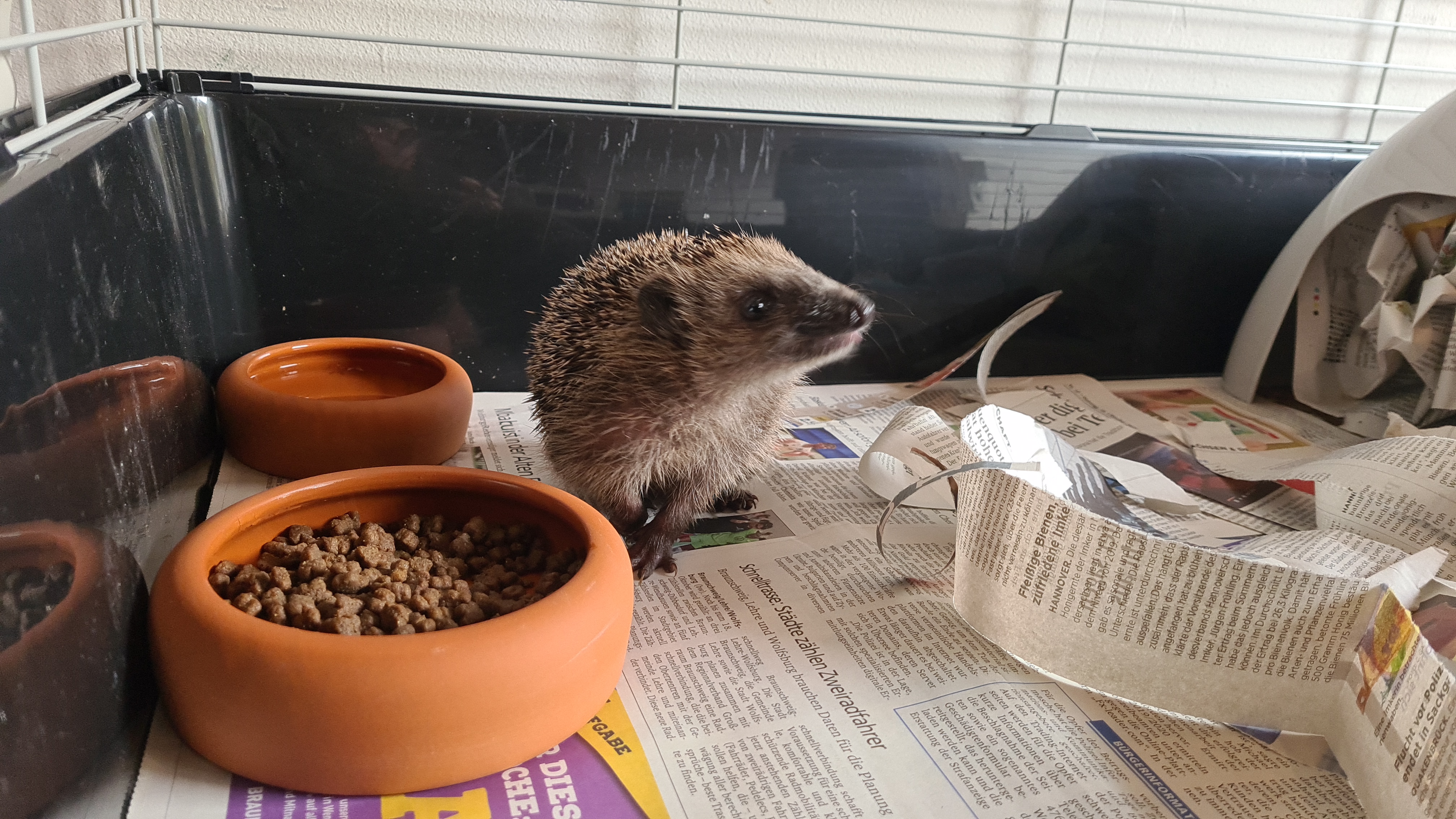 Der Igel wird bei Zimmertemperatur (mind 20 Grad) in einem Kleintierkäfig (zb Ferplast ca 95x57cm) oder in der Ikea Samla Box (130 Liter) gehalten.